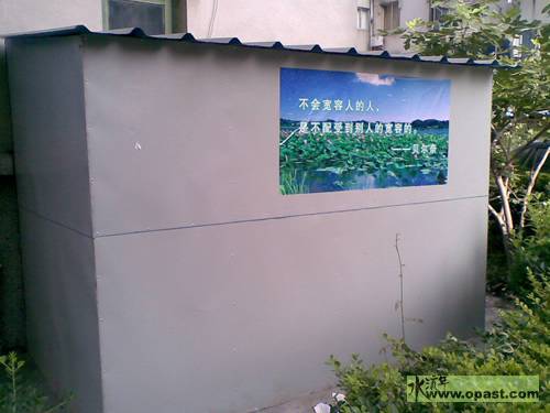 这是拍摄于某小区的违章搭建车棚,看看上面贴的那张画,看看上面的那句标语: